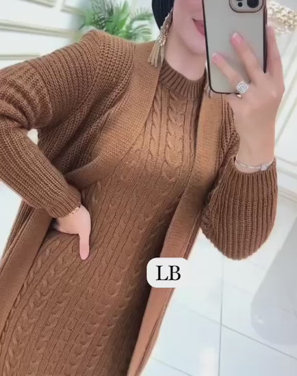 An elongated knit silhouette layered with a fluid open-front cardigan for understated sophistication. Defined by clean lines and a softly sculpted form for modern elegance.