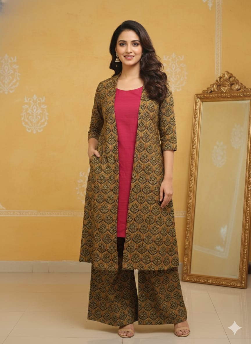 Where tradition meets quiet luxury — the Amber Royale Co-ord Set blends earthy tones with contemporary tailoring. Featuring a long open jacket with heritage-inspired prints over a rich magenta inner, it’s designed for the woman who defines elegance on her own terms.