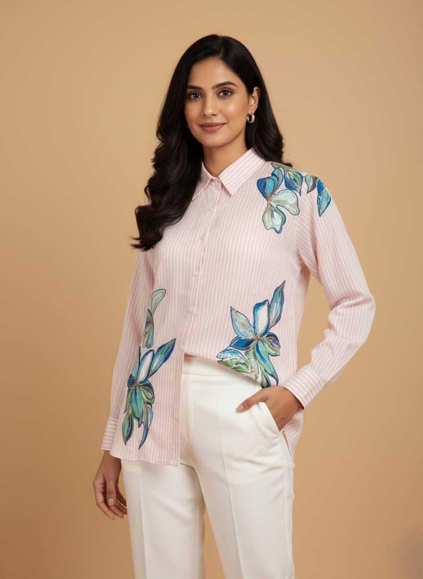 A soft pastel shirt elevated with hand-drawn floral embroidery, blending artisanal charm with modern minimal elegance.