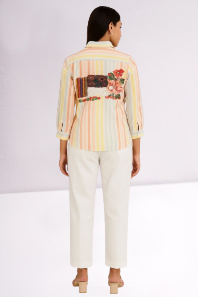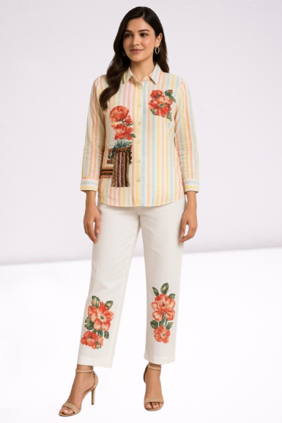 Pastel Stripe & Orange Floral Hand-Painted Co-ord Set 🧡