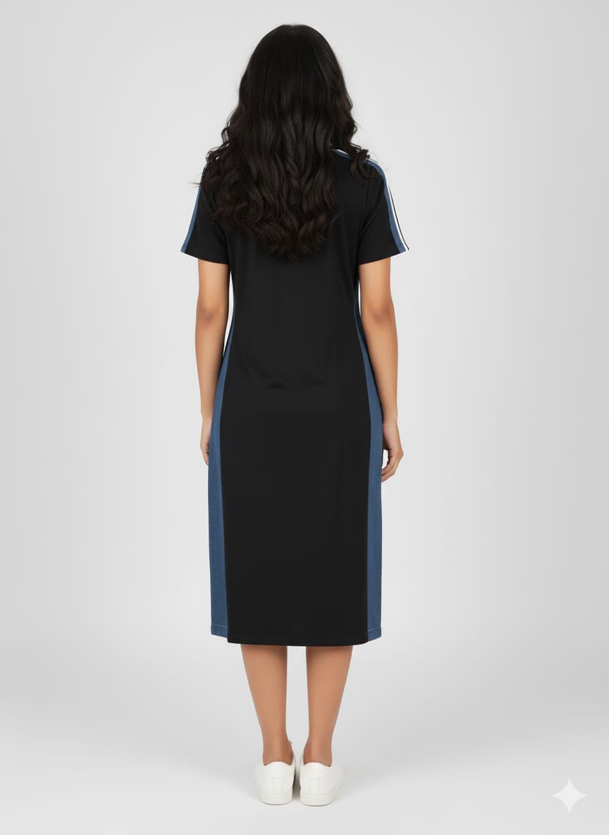- Detailing: Contrast sport-block bodice with subtle embroidered typography