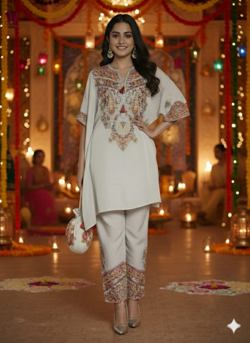 - Design: Asymmetrical embroidered kurta paired with printed hem pants and a matching potli bag