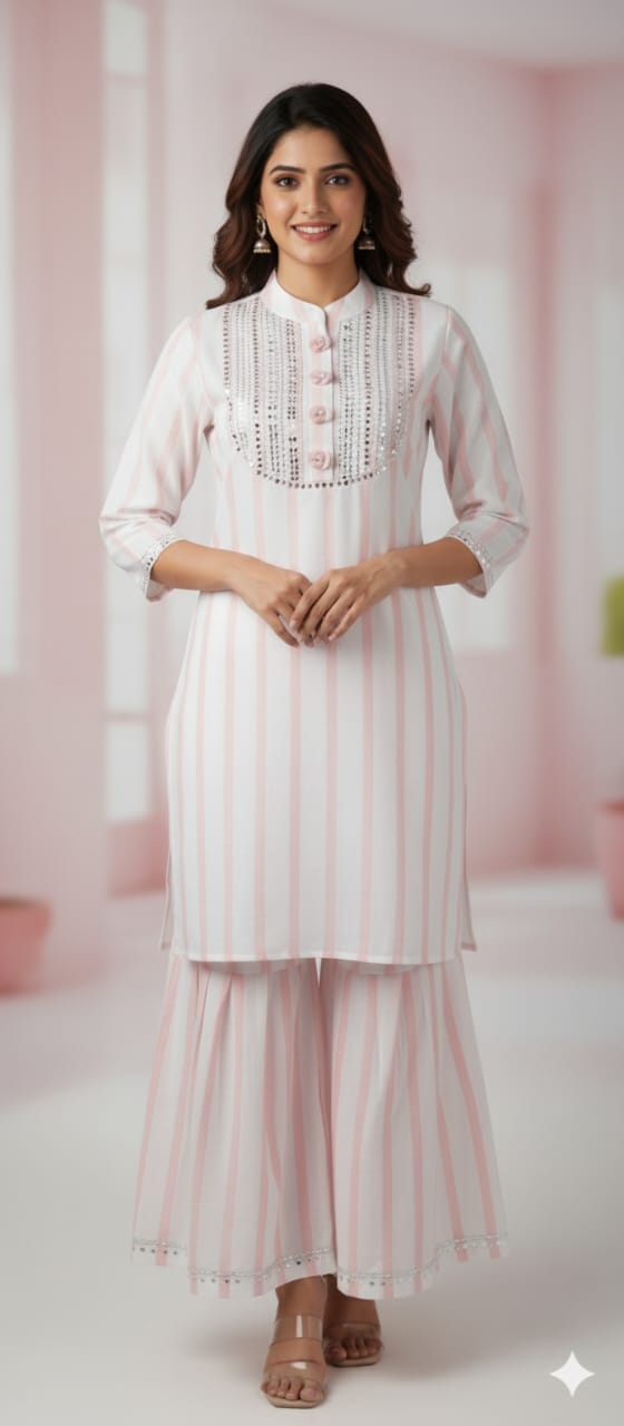 Effortlessly elegant, the Ethnic kurta and sharara set blends pastel grace with structured tailoring — minimal yet unmistakably luxe.