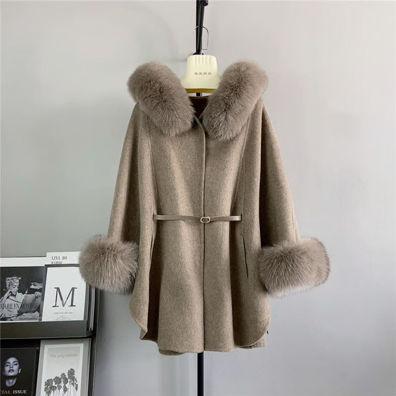 A refined woolen cape-style jacket accented with plush faux-fur trims for understated elegance.