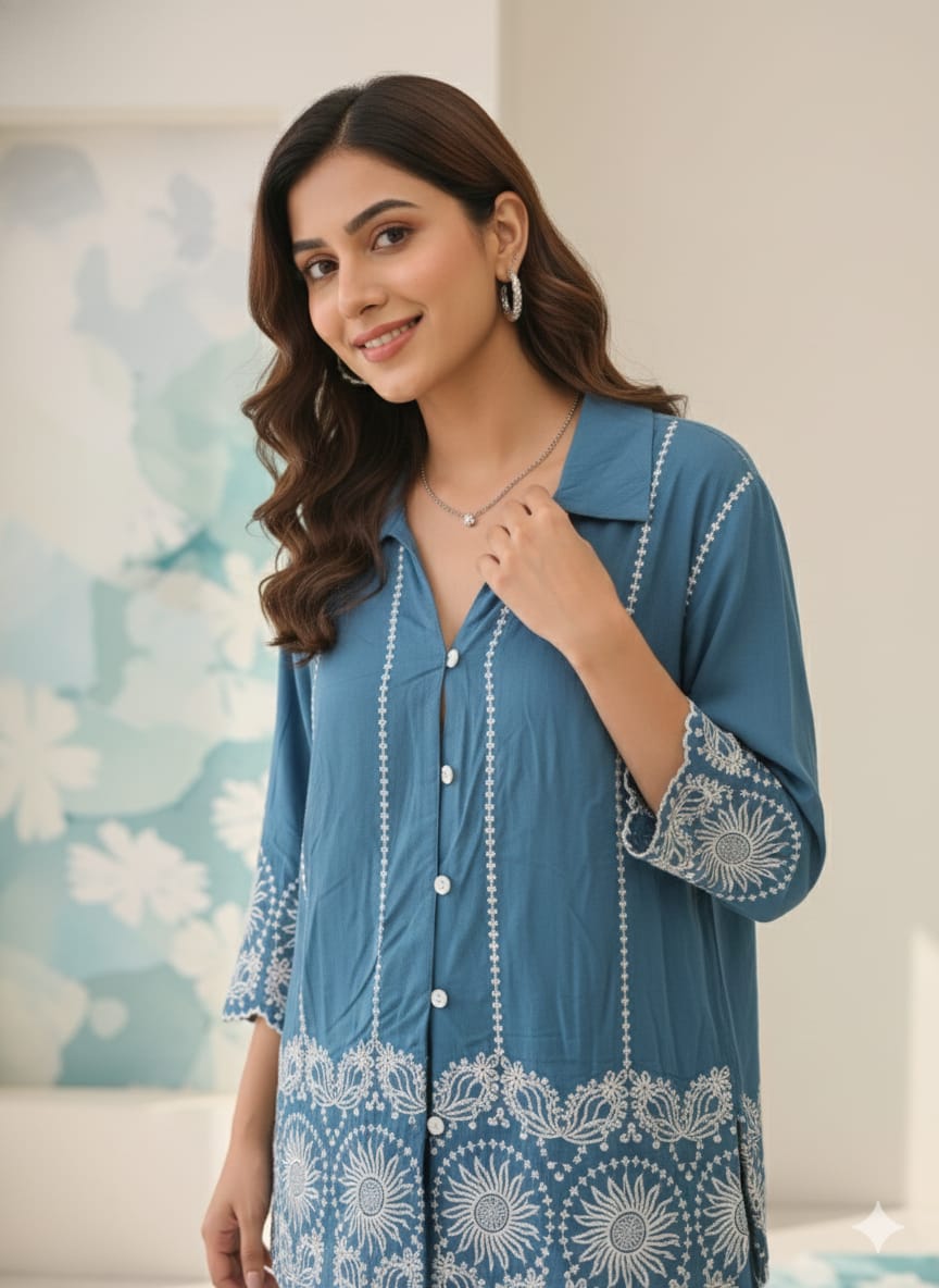 A timeless co-ord set crafted in a rich azure hue, elevated with intricate white threadwork. Designed for effortless elegance, it brings together comfort, grace, and understated sophistication.