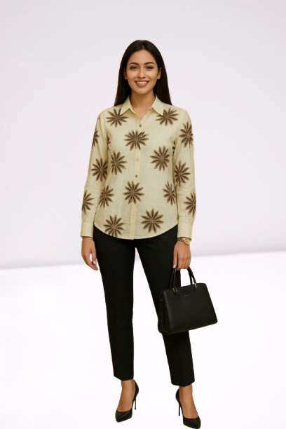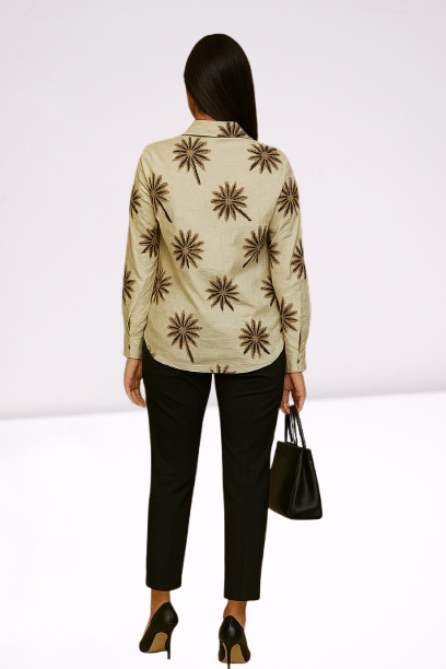 A stunning and modern two-piece ensemble that offers a seamless, artistic look. The set features a classic white button-down shirt and matching wide-leg trousers, both embellished with a continuous hand-painted Teal and Aqua floral motif running vertically along the placket and the trouser outseams. The hand-painted panel is accented with subtle trim, making this set an effortless, high-impact statement for resort or designer casual wear.