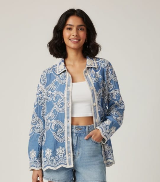 A poetic fusion of folk-inspired artistry and modern tailoring, designed for elevated yet effortless styling. Soft, calming blue tones evoke relaxed sophistication.
